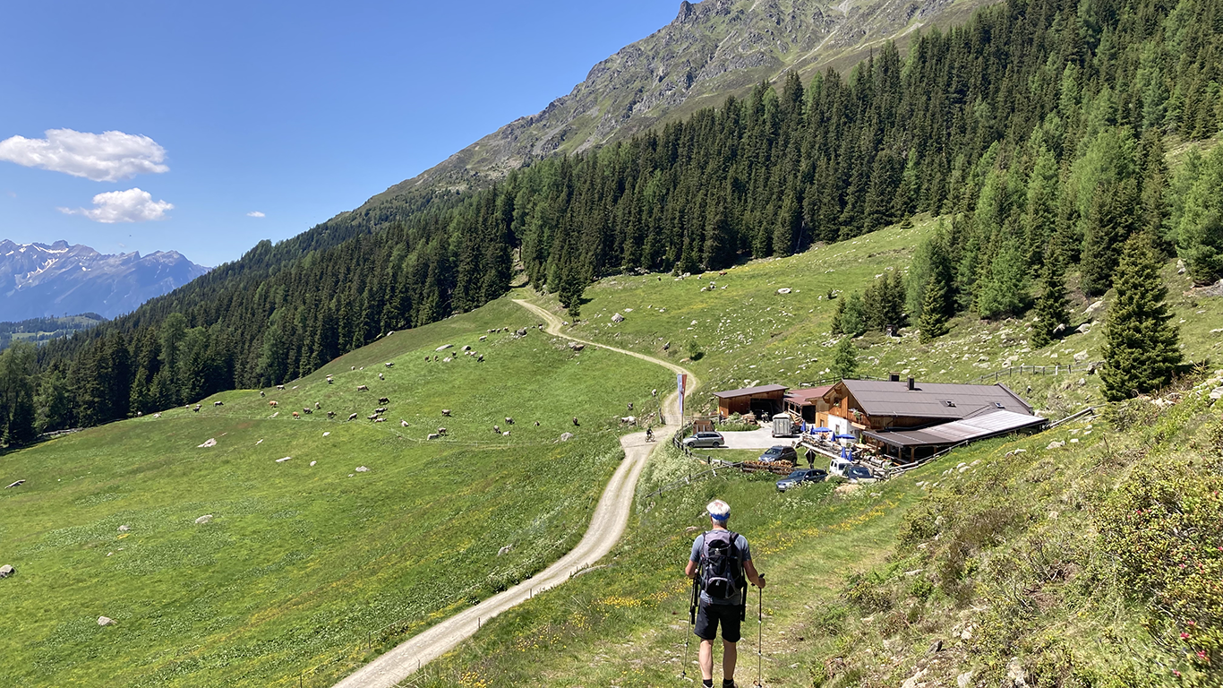 Ausgangspunkt unserer heutigen Wanderung ist die Falkaunsalm auf 1962 m, die direkt am Dr. Angerer-Panoramaweg liegt. Die Alm ist sehr gepflegt, es gibt hauseigenen Käse und Milchprodukte. Die Alm ist auch mit dem PKW zu erreichen.